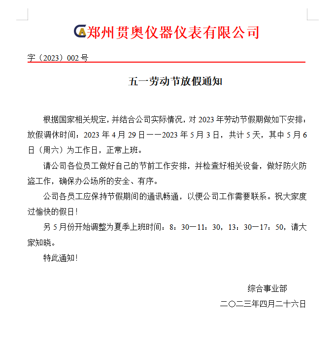 根據(jù)國(guó)家相關(guān)規(guī)定,并結(jié)合公司實(shí)際情況,對(duì)2023年勞動(dòng)節(jié)假期做如下安排: