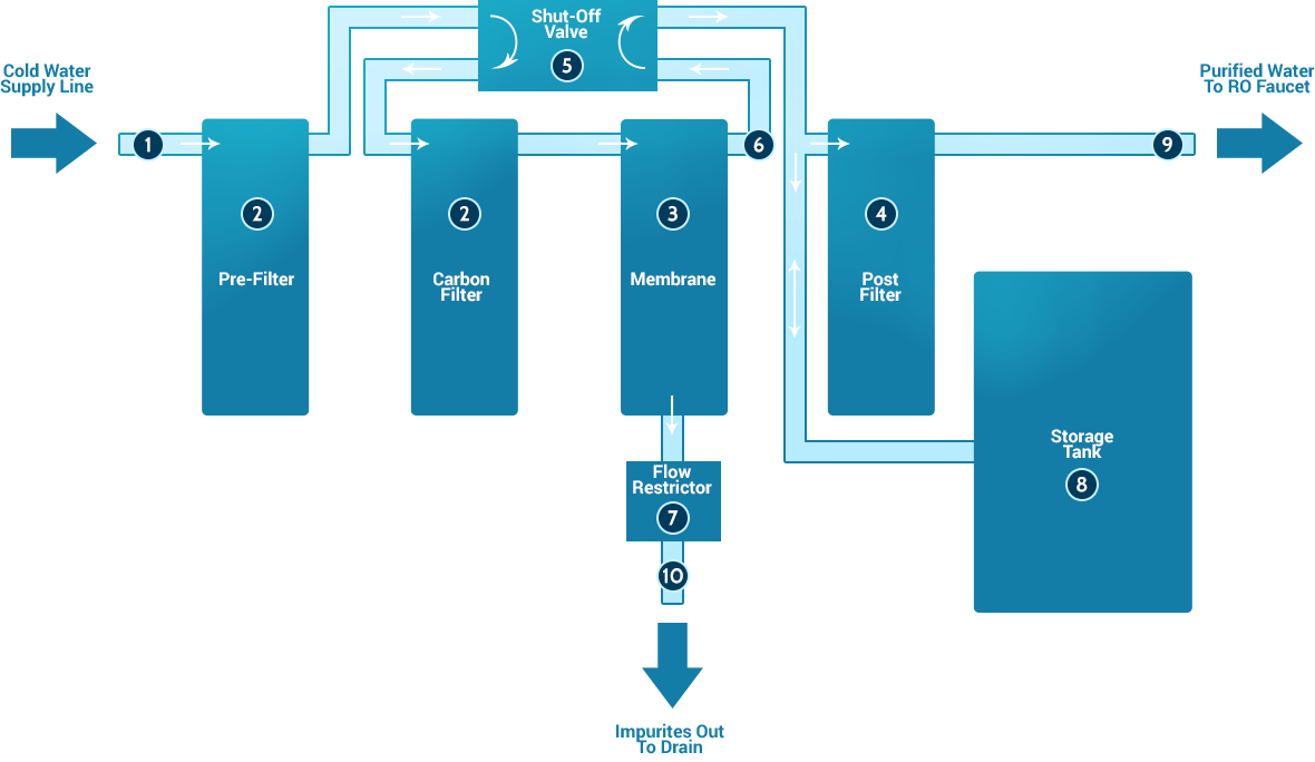 后過濾器: 水離開RO儲罐后,但在進(jìn)入RO水龍頭之前,處理后的水經(jīng)過最終的“后過濾器”。后過濾器通常是碳過濾器。通過后過濾“拋光”過濾器,從產(chǎn)品水中除去任何剩余的味道或氣味。