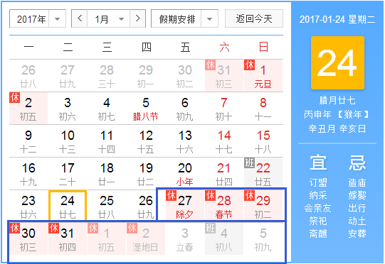 一、放假時間:2017年1月25日(農(nóng)歷臘月二十八)至2017年2月5日(農(nóng)歷正月初九),共計十二天,2017年2月6日(農(nóng)歷正月初十)正式上班。