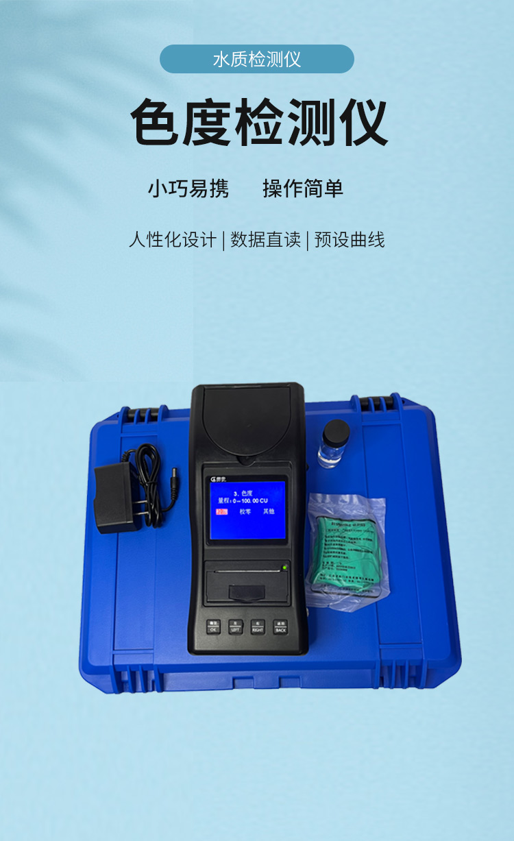 水質(zhì)色度是對天然水或處理后的各種水進(jìn)行顏色定量測定時的指標(biāo)。潔凈的天然水,在水層比較淺時為無色透明,水深時為淺藍(lán)色;水體中如果含有雜質(zhì),會使水呈現(xiàn)不同的顏色。例如,黏土能使水帶黃色;植物性有機(jī)物 溶于水中,使水呈現(xiàn)淡黃色乃至棕黃色;水中藻類大量存在時呈現(xiàn)綠色;鐵的氧化物會使水變褐色;硫